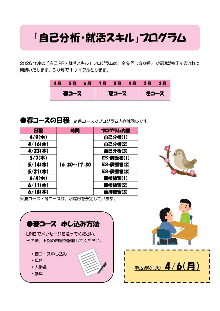なお、自己分析・就活スキルコース、コミュニケーション講座、JST、グループワーク等のプログラムは、引き続き参加者を募集しております。