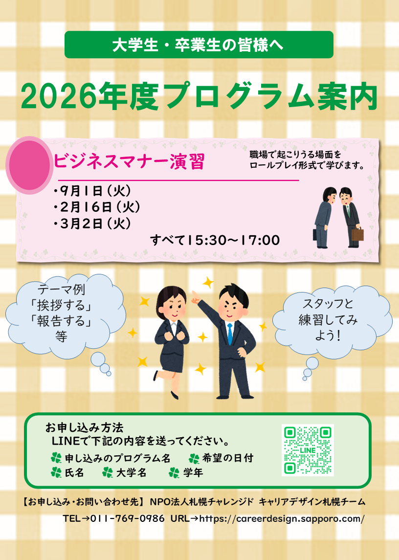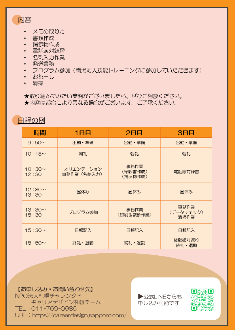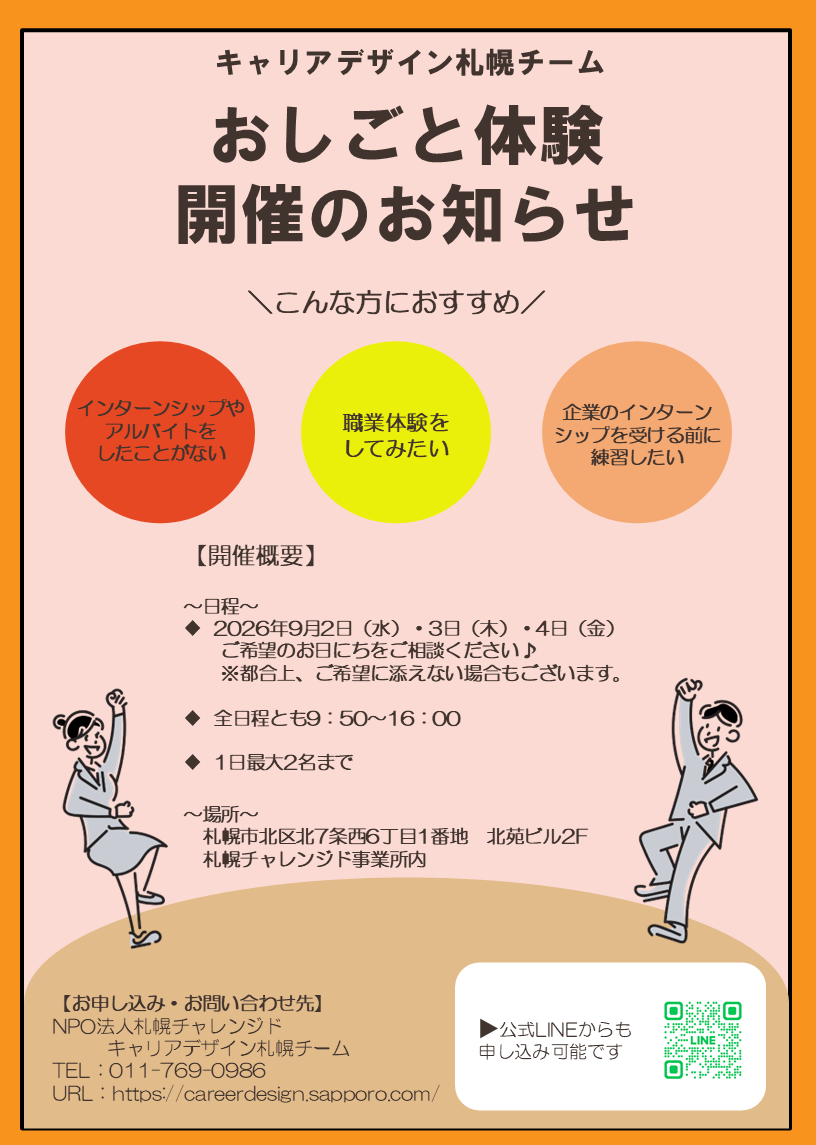 インターンシップやアルバイトをしたことがない学生を対象に、札幌チャレンジドでインターンシップを実施します。
